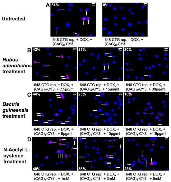 Foci formation and antioxidant treatment. The panel shows the percentage of cells with foci in the inducible glial DM1 cell model under study and the effect of the antioxidants on foci accumulation. MIO-M1 CTG(648)-induced cells without antioxidant treatment ((A)—top-left panel) show 51% of cells with foci, which is decreased after treating these cells with polyphenol extracts from Rubus adenotrichos ((B)—going down by up to 20%), polyphenol extracts from Bactris guineensis ((C)—going down by up to 18%), and NAC ((D)—going down by up to 28%). MIO-M1 CTG(648) uninduced cells as a negative control of antioxidant treatment (top-right) show 0% of cells with foci. A dose-dependent effect of the antioxidant is seen in each treatment condition ((B–D)—a decrease in the % of cells with foci from left to right). Arrows indicate the presence of cells with foci (nuclei stained with DAPI).