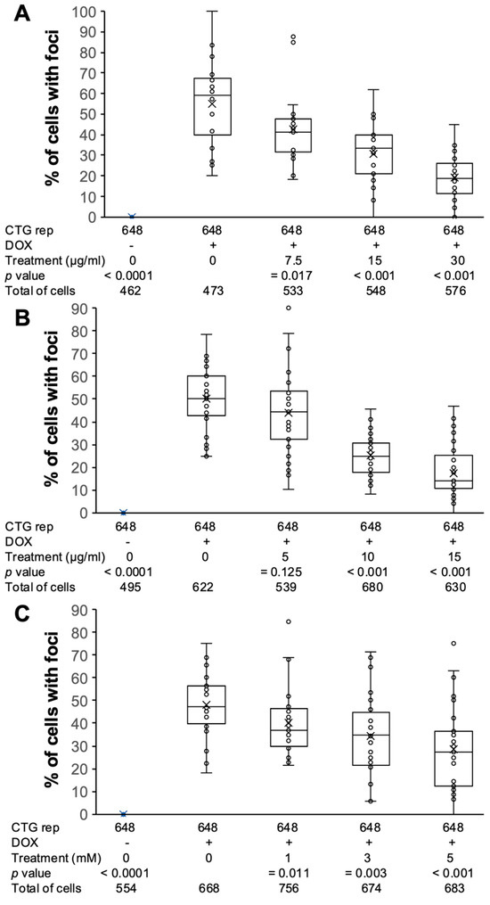 Taking advantage of the fact that the MIO-M1 CTG(648) model recapitulates some of the key features of DM1 [55], such as RNA foci accumulation, we sought to determine whether natural antioxidants could reduce the percentage of DM1 cells with RNA foci. We conducted fluorescence in situ hybridization (FISH) and quantified the percentage of cells with foci. As expected, induced MIO-M1 CTG(648) cultures showed 51% of cells with foci, while uninduced cultures showed 0% (Figure 3A). After confirming foci accumulation, we treated MIO-M1 CTG(648) cells with natural antioxidants at three different concentrations and measured the percentage of cells with foci following treatment. Remarkably, after treatment with (1) polyphenol extracts from Rubus adenotrichos, we observed a reduction in foci accumulation from 51% to 20% (Figure 3B and Figure 4A); (2) polyphenol extracts from Bactris guineensis, foci accumulation decreased from 51% to 18% (Figure 3C and Figure 4B); and (3) NAC, foci accumulation dropped from 51% to 28% (Figure 3D and Figure 4C). In all three treatments, the reduction in foci was dose-dependent, indicating a negative correlation between foci accumulation and antioxidant concentration—higher antioxidant concentrations led to a greater, significant reduction in cells with foci (Figure 4, ANOVA, p < 0.05). However, it is possible that antioxidants may inhibit the expression of toxic RNA rather than disrupting already-formed foci. To test this, we repeated the FISH experiment, but this time, we first induced the expression of the construct with DOX, and then, we treated the cells with antioxidants (we used only the highest concentration). We analyzed about 10 different optical fields and calculated the percentage of cells with foci per condition. Our results show that the percentage of cells with foci significantly decreased to around 15% (Figure S2, ANOVA, p < 0.0001), consistent with previous results (Figure 3 and Figure 4), and confirming the protective effects of the tested antioxidants (Figure S2).