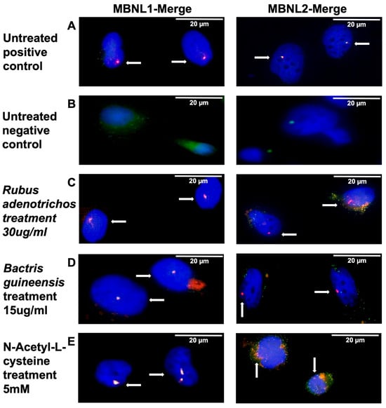 MBNL1/2 colocalization and antioxidant treatment. These panels correspond to a magnification of panels shown in Figure S3. The panels show MBNL1 (left panels) and MBNL2 (right panels) foci colocalization in different culture conditions. (A)—MIO-M1 CTG(648)-induced cells without antioxidant treatment. Colocalization is observed for both MBNL1 and MBNL2. (B)—MIO-M1 CTG(648)-uninduced cells without antioxidant treatment. Colocalization is not observed for both MBNL1 and MBNL2. (C)—MIO-M1 CTG(648)-induced cells treated with the highest concentration of polyphenol extracts from Rubus adenotrichos. Clearer colocalization is observed for MBNL1 but not for MBNL2. (D)—MIO-M1 CTG(648)-induced cells treated with the highest concentration of polyphenol extracts from Bactris guineensis. Clearer colocalization is observed for MBNL1 but not for MBNL2. (E)—MIO-M1 CTG(648)-induced cells treated with the highest concentration of NAC. Clearer colocalization is observed for MBNL1 but not for MBNL2. Arrows show some of the signals corresponding to colocalization or the absence of colocalization.