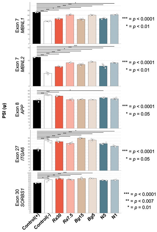 DM1 splicing rescued by antioxidant treatment. The figure shows the PSI of five different alternative exons (labeled on the left-hand side of each plot) analyzed by different culture conditions (columns labeled at the bottom of the figure). When compared to the uninduced MIO-M1 CTG(648) cells (second column–control (−)), we observed in the induced MIO-M1 CTG(648) cells (first column–control (+)) a significantly increased exon inclusion for exons in MBNL1/2 genes; while for the other three exons analyzed, we observed, in the positive control, a significantly increased exon exclusion. After treating the cells with polyphenol extracts from Rubus adenotrichos (columns Ra30 and Ra7.5), polyphenol extracts from Bactris guineensis (columns Bg15 and Bg5), and NAC (columns N5 and N1) we observed a significant rescue in the PSI for most of the exons in most of the conditions and observed a dose-dependent effect (only the highest and lowest concentration of the antioxidant were tested). Statistical analysis was carried out using ANOVA (Tukey); p-values are on the right-hand side of each plot.