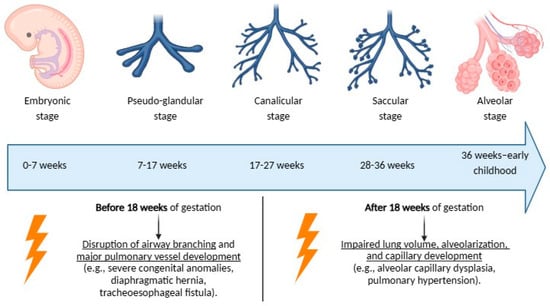 Prenatal lung development is classically divided into five stages from 3 to 36 weeks of gestation: the embryonic, pseudo-glandular, canalicular, saccular, and alveolar stages (Figure 1). Each phase represents a critical window during which specific structural and functional components of the lungs are established [].