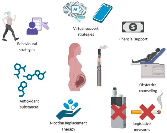 Smoking cessation remains the cornerstone of preventing the harmful effects of e-cigs on both the mother and fetus []. Despite the well-documented risks to lung development and overall fetal health, a significant number of pregnant women continue smoking due to addiction, limited access to support, or socioeconomic barriers [,,]. Successful cessation strategies, therefore, play a critical role in reducing these risks []. The effectiveness of various smoking cessation interventions has been extensively evaluated. Behavioural counselling is one of the most effective interventions for smoking cessation during pregnancy. Evidence from systematic reviews demonstrated that intensive psychosocial support, including motivational interviewing and behavioural therapies, can significantly increase cessation rates. Counselling programs tailored to the unique needs of pregnant women are especially effective, particularly when delivered through multiple sessions by trained professionals [,]. Physical activity programs have been explored as adjunct strategies to traditional behavioural support []. Although their effectiveness in promoting smoking cessation during pregnancy remains uncertain, physical activity contributes to overall health benefits and has been shown to reduce smoking urges in non-pregnant individuals. These findings suggest the potential for further research of these interventions in future studies []. Emerging technologies such as Artificial Intelligence (AI) have introduced innovative approaches to smoking cessation []. AI-powered tools can provide real-time, personalized support, analyse individual behavioural patterns, and predict relapse risks []. For instance, mobile applications can deliver motivational messages, monitor smoking habits, and recommend tailored coping strategies. Virtual support groups facilitated by AI platforms have also proven effective in fostering community engagement []. Financial incentives have been identified as another effective tool in promoting smoking cessation among pregnant individuals, particularly those from disadvantaged socioeconomic backgrounds. Studies reveal that offering monetary or voucher-based rewards for achieving abstinence significantly increases cessation rates and reduces the economic burden of smoking-related complications [,,].