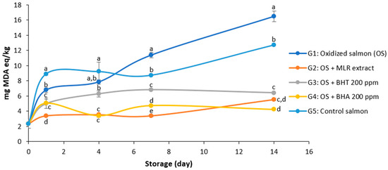 Figure 2 shows the malondialdehyde (MDA) levels over the storage period of salmon under different treatment groups. The optimized MLR extract obtained by ultrasound, containing 916.65 µg polyphenols/g dw (Table 3), was used to evaluate its effectiveness in preserving salmon. Ozonized water (37 mg/mL) increased MDA formation in the salmon, reaching a maximum value of 16.49 mg MDA eq/kg on day 14. MDA formation was significantly reduced by the synthetic antioxidants BHT and BHA, and by the optimized MLR extract, decreasing MDA levels by 61.09%, 74.22%, and 66.44%, respectively, on day 14. At the end of the storage period, no significant differences in MDA levels were observed between the 200 ppm concentration of the synthetic antioxidant BHT and the optimized MLR extract, nor between the MLR extract and the 200 ppm concentration of BHA. To assess whether ozonated water induced oxidation in salmon, a control group was included in which salmon was stored with water alone (Group 5). This group exhibited a significantly lower increase in MDA levels compared to those stored with ozonated water.
