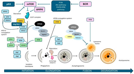 The autophagic process is typically divided into distinct stages, including initiation, nucleation, elongation, lysosome fusion, and autophagosome degradation [17]. Each step is characterized by specific molecular events and regulatory mechanisms that ensure the efficient turnover of cellular components and adaptation to stress conditions [20,21]. Understanding these stages in detail is crucial for elucidating the role of autophagy in health and disease, as well as for identifying potential therapeutic targets in pathological contexts.