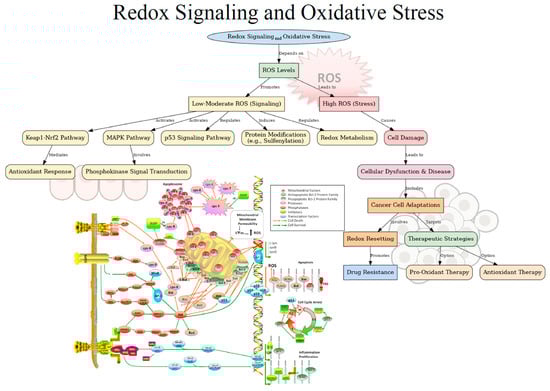 Upon therapy, some tumor cells undergo redox resetting, acquiring a new balance with higher ROS levels and stronger antioxidant systems. This enables cancer cells to resist anticancer drugs through mechanisms like increased drug efflux, altered drug metabolism, mutated targets, activated pro-survival pathways, and reduced cell death [115]. Understanding these mechanisms offers promising strategies to overcome drug resistance and improve treatment outcomes [120]. Furthermore, during metastasis, cancer cells face significant oxidative stress as they migrate through diverse environments. To survive, they undergo reversible metabolic changes that enhance oxidative stress resistance. However, oxidative stress can also induce ferroptosis, limiting the survival of metastasizing cells [112,121]. Given the role of ROS in cancer, therapeutic strategies often target redox status. Pro-oxidant therapies aim to increase oxidative stress in cancer cells, while antioxidant therapies seek to reduce it. Natural substances from plants have chemopreventive potential by modifying redox status [122,123,124]. Therefore, redox reactions and oxidative stress are central to cancer biology, affecting tumor development, progression, and response to treatment.
