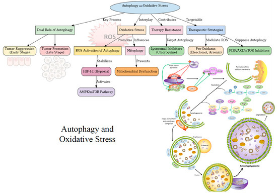 Given the complexity and heterogeneity of tumors, autophagy and oxidative stress have emerged in recent years as critical cellular processes in cancer development and progression. These mechanisms play pivotal roles in human health. Autophagy is an essential mechanism for maintaining cellular homeostasis [2,3], for preventing metabolic imbalance and the accumulation of cytotoxic elements within cells, and for prolonging cell survival [4,5,6,7,8]. On the other hand, oxidative stress arises from an imbalance between the production of reactive oxygen species (ROS) and the effectiveness of cellular antioxidant defenses. This imbalance often leads to DNA damage, genomic instability, cellular dysfunction, and disease [3,9]. While autophagy can limit oxidative stress by degrading damaged mitochondria (mitophagy), excessive levels of ROS can trigger autophagic activity to promote cell survival under adverse conditions [3,10]. Autophagy and oxidative stress are deeply interconnected in biology, with their roles oscillating between protective and pathological depending on the context [11]. This review explores the intricate relationship between autophagy and oxidative stress, examining their dual roles in tumorigenesis, their implications for therapeutic intervention, and potential future research directions to further elucidate these complex processes that may exhibit a synergistic and dual role, acting as both tumor suppressors and promoters depending on the specific cellular and microenvironmental context [12,13,14,15].