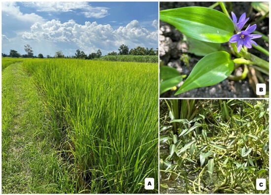 M. angustifolia: (A) rice field, its natural habitat in Thailand; (B) floral part; (C) vegetative part. All photos were taken in Thailand by Assoc. Prof. Dr. Duangjai Tungmunnithum.