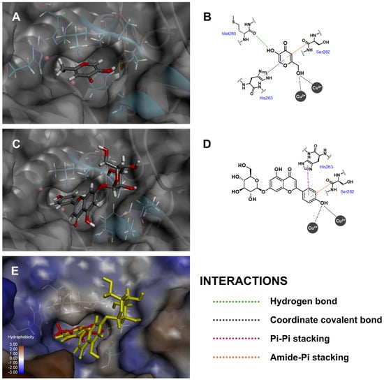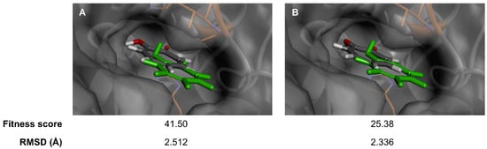 Flavonoids and their glycosides are valuable plant metabolites and have served extensively as active ingredients in medicines [55], supplements [56] and cosmetics [57], especially for their potential anti-aging candidates [58,59]. Api-7-O-Glc, a major component in a traditional lotus, namely M. angustifolia [24], found in Thailand, was first used to analyze the anti-aging activity through molecular docking studies, alongside in vitro assays, targeting three skin-aging-related enzymes, including collagenase, elastase and tyrosinase. The reliability of the scoring functions, GoldScore and ChemScore, and reproducibility of binding interactions were validated by self-docking 2-hydroxycyclohepta-2,4,6-trien-1-one, the co-crystallized ligand, into the binding site of tyrosinase. Due to coordination with the copper (II) ion, the postures computed by GoldScore and ChemScore showed minor deviations from the crystal structure (Figure 2), with a root-mean square deviation (RMSD) value of 2.512 and 2.336 Å, respectively. These RMSD values, both less than 3 Å, indicated acceptable and reliable docking results [60,61]. GoldScore was selected for further docking studies based on its higher fitness score relative to ChemScore.