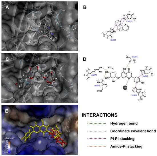 Three-dimensional conformations and two-dimensional interaction diagrams of (A,B) 1,10-phenanthroline, (C,D) Api-7-O-Glc in collagenase enzyme, along with (E) superimposed view of 1,10-phenanthroline (red) and Api-7-O-Glc (yellow).