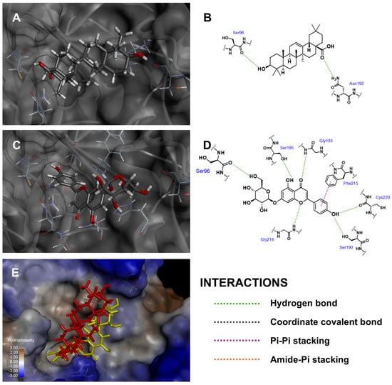 Three-dimensional conformations and two-dimensional interaction diagrams of (A,B) oleanolic acid, (C,D) Api-7-O-Glc in elastase enzyme, along with (E) superimposed view of oleanolic acid (red) and Api-7-O-Glc (yellow).