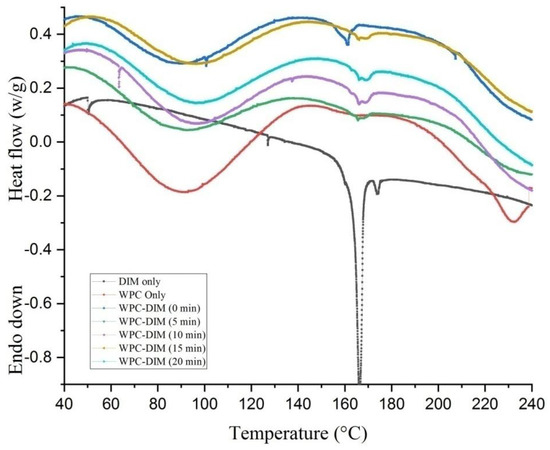 The thermal properties of native DIM, WPC only, and ultrasound-treated WPC–DIM nanoparticles with various sonication times (0–20 min) are shown in Figure 3. The onset temperature (Ton), denaturation peak temperature (Td), denaturation temperature range (ΔTd), and denaturation enthalpy (ΔHd) were analyzed using a software and are presented in Table 4. The native DIM had a sharp endothermic peak around 170 °C and 175 °C, which suggests the melting temperature of DIM; a similar observation was previously reported [3]. Similarly, the native whey protein concentrate showed a broad endothermic peak at around 87 °C, which corresponds to heat-induced changes in β-lactoglobulin (the major component of whey protein concentrate) [10]. In addition, the denaturation peak temperature (Td) (90 °C) and denaturation enthalpy (ΔHd) (179 m W/g) were found to be almost similar to native whey protein concentrate. The thermal stability of the whey protein suggests it would be appropriate for nanoencapsulation of thermo-sensitive substances. Additionally, after sonication of WPC–DIM nanoparticles with various sonication times, the nanoparticles had much greater denaturation peak temperature (Td) and denaturation temperature range (ΔTd) as compared to the untreated sample (Table 4). After ultrasound treatment for 5, 10, 15, and 20 min, the Tds of the WPC–DIM nanoparticles were 90.57, 93.9, 94.96, and 96 °C, respectively, which were enhanced compared to the untreated sample (90.46 °C). In the same way, the ultrasound treatment shifted the denaturation temperature range (ΔTd) in comparison to the untreated sample (Table 4). These ultrasound-induced changes could be caused by the enhanced electrostatic and hydrogen bonding interactions between DIM and whey protein concentrate, which made the structure of WPC–DIM nanoparticles more compact. The ultrasonic treatment also enhanced thermal stability and formed new structures, and more energy would be required to break the macromolecular structures [23]. Moreover, ultrasound treatment can increase the melting temperature due to molecular aggregation by intermolecular hydrogen bonding interactions between hydrophilic head groups [25].