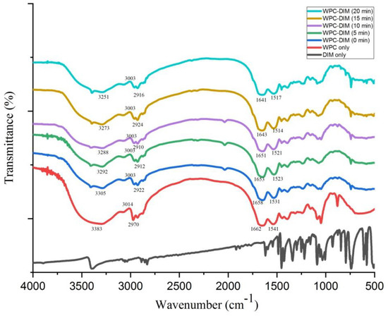 Fourier transform infrared (FT-IR) spectroscopy was applied to obtain the information about the intermolecular interactions inside WPC–DIM nanoparticles. The FTIR spectra of WPC only, native DIM, and WPC–DIM nanoparticles with various sonication times were recorded (Figure 4). The native whey protein has a prominent and broad absorption at 3383 cm−1 caused by the O–H stretching vibration. Also, the peak at 2970 cm−1 in native whey protein concentrate may be related to the C–H stretching vibrations, and the strong absorption peaks at 1662 cm−1 and 1541 cm−1 are related to the C=O stretching vibration and N–H bend. Similar results of whey protein concentrate FTIR spectra were previously observed [8]. After encapsulation of DIM in whey protein concentrate nanoparticles, the WPC–DIM nanoparticles without ultrasound showed interesting characteristic functional groups: the strong peak at 3305 cm−1 which relates to N–H stretching was shifted to 3292 cm−1, 3288 cm−1, 3273 cm−1, and 3251 cm−1 after ultrasound treatment for 5, 10, 15, and 20 min, respectively. Previous results confirmed that encapsulation using the ultrasound method can change hydrogen bonds from 3355 cm−1 to 3322 cm−1~3315 cm−1 [25]. The infrared spectrum of the WPC-only sample has changed from 3014 cm−1 to 3008 cm−1 (C–H stretching vibrations) in comparison to the WPC–DIM nanoparticles (without ultrasound), whereas no significant effect of the ultrasound treatment with various sonication times on C–H stretching vibrations was observed. The results were consistent with previous findings on the effect of ultrasound on the oil and water emulsion of whey protein [36]. The electrostatic interactions and hydrogen bonding of DIM and whey protein concentrate in the WPC–DIM nanoparticles was confirmed by the presence of an amide I band (1640–1690 cm−1, C=O stretch) and amide II band (1510–1560 cm−1, N-H bend) [37]. These findings were in line with our previous results; similar results were obtained by encapsulated DIM in polymerized whey protein [10]. After the sonication of nanoparticles with various sonication times, changes in the amide I and amide II wavelengths were observed and peaks were remarkably changed from 1658 cm−1 to 1653–1641 cm−1 and 1531 cm−1 to1523–1517 cm−1, respectively. In addition to this, the intensity of absorption in the amide I and amide II bands were increased (Figure 4), indicating the binding between DIM and whey protein concentrate [38]. Hence, these characteristic peaks suggest that more stable and strong hydrogen bonding and electrostatic interactions were obtained between DIM and whey protein concentrate after ultrasound treatment [25]. The amide I and amide II bonds were actively involved in hydrogen bonding between different elements contributing to the secondary structure of proteins. Many studies revealed that ultrasonication can change the secondary structure of proteins, such as α-helix, β-sheet and β-turn [36]. The electrostatic interactions and stronger hydrogen bonding recorded in the WPC–DIM nanoparticles after ultrasound treatment with various sonication times could be attributed to the change in the secondary structures of protein.