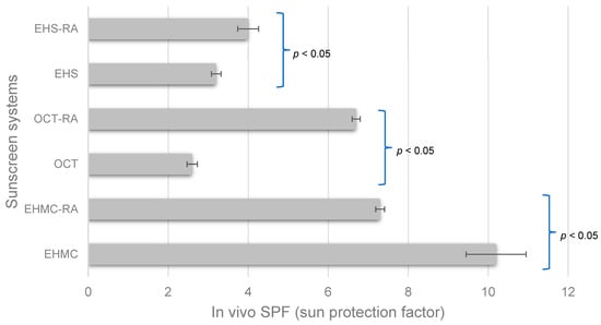 In vivo SPF (sun protection factor) the sunscreen systems (n = 10). EHMC—ethylhexyl methoxycinnamate; OCT—octocrylene; EHS—ethylhexyl salicylate; RA—rosmarinic acid.