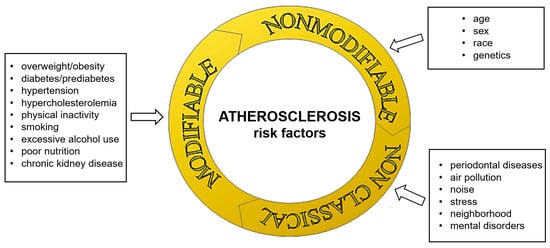 Atherosclerosis is a chronic inflammatory process affecting large and medium-sized arteries. It involves the deposition of lipids in the intima of arteries, the accumulation of both physiological and modified immune system cells and smooth muscle cells, as well as the accumulation of cell breakdown products, which leads to the formation of the atherosclerotic plaques. As a consequence, the biological properties of the vessel are lost and its lumen is gradually reduced, which results in insufficient supply of tissues with oxygen and nutrients [1]. The development of diseases resulting from atherosclerosis depends on many factors. The most important, known to date risk factors for the development of atherosclerosis are shown in Figure 1, including “poor nutrition”, which is understood as both caloric imbalance (either excess or deficiency) and insufficient intake of essential micronutrients, such as vitamins and minerals.