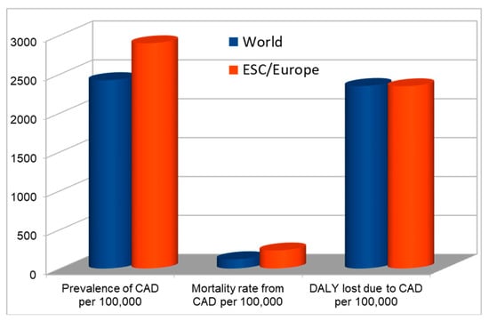 According to data from the ESC (European Society of Cardiology), in the countries associated with this organization, CAD is responsible for 45.8 million DALYs (2342/100,000), and this rate is twice as high in men than in women (3262 vs. 1616/100,000) [5].