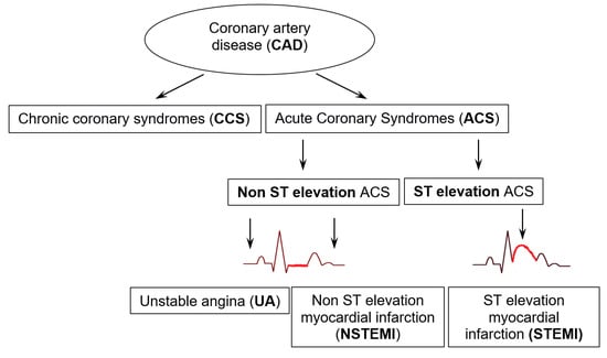 Acute coronary syndromes (ACSs) refer to a group of conditions resulting from a sudden or progressively increasing restriction or cessation of blood flow in the coronary arteries. When there is no myocardial cell necrosis due to the disturbance in blood flow, unstable angina (UA) is diagnosed. However, if recent damage to the heart muscle is indicated by an elevated level of troponin in the blood—a protein part of the contractile apparatus—a myocardial infarction (MI) is diagnosed. To confirm a myocardial infarction, the troponin level must be accompanied by at least one clinical criterion [7]. The distinction between ST-elevation myocardial infarction (STEMI) and non-ST-elevation myocardial infarction (NSTEMI) is made based on ECG findings (Figure 3).