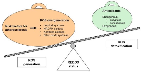 Numerous data in the literature confirm that the presence of ROS plays an important role both at the stage of the initiation and maintenance of the atherosclerotic process. Potential sources of ROS in blood vessel cells include NADPH oxidase, respiratory chain, xanthine oxidase, nitric oxide synthase, cyclooxygenase, myeloperoxidases, and lipoxygenases [43].