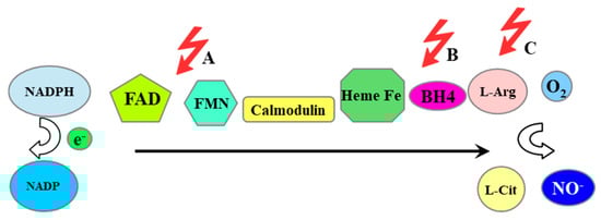 Mechanism of action of NOS and potential uncoupling sites. The red arrows mark the places of potential uncoupling of the NOS: A. S-glutathionylation prevents the transport of an electron from FAD to FMN, and the electron is transferred directly to O2 to form a superoxide anion radical. B. Deficiency/oxidation of BH4 disrupts the flow of the electron, which is transferred to O2 without the use of arginine. C. L-arginine deficiency results in oxygen being the electron acceptor.