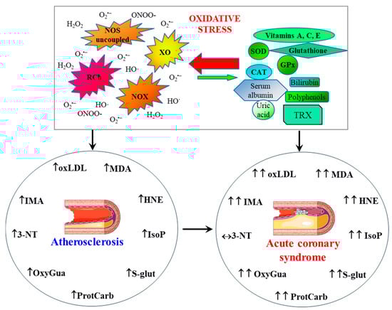 The above-mentioned data regarding changes in the level/activity of selected antioxidants and the content of markers of oxidative modifications of lipids, proteins, and nucleic acids in atherosclerosis and ACS are summarized and presented schematically in Table 4.