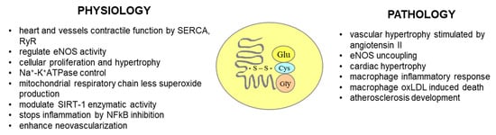 Physiological and pathological role of S-glutathionylation in circulatory system. SERCA—sarco/endoplasmic reticulum Ca2+-ATPase; RyR—ryanodine receptor; eNOS—endothelial nitric oxide synthase; Na+-K+ATPase—sodium/potassium pump; SIRT-1—sirtuin 1; NFkB—nuclear factor kappa B; Glu—glutaminic acid; Cys—cysteine; and Gly—glycine.