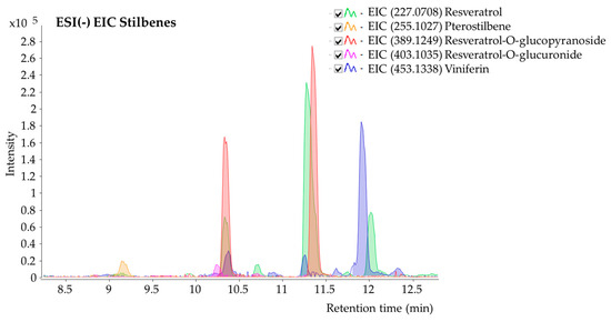 Following acquired MS data, stilbene aglycones, glucoside, and glucuronide derivatives, as well as dimers, were traced in the studied methanolic extract (Table 3). Under the conditions used, most of the detected compounds had intensive signals corresponding to the deprotonated adduct [M-H] (Figure 1). MS data cannot allow for distinguishing between viniferin, resveratrol, or pterostilbene isomers. However, resveratrol isomers were discerned according to relative abundance (trans-resveratrol isomer) which is more stable and abundant [36] and based on comparison with the literature data [25].