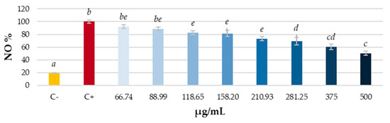RAW 264.7 cells were plated in a 96-well plate at a density of 6 × 105 cells per well and incubated 24 h at 37 °C in a 5% CO2 atmosphere. After incubation, the cells were treated with either culture medium (negative control), 1 μg/mL of LPS (positive control), or with LPS and varying concentrations of grapevine leaf extract (37.5, 75, 125, 250, and 500 μg/mL) for an additional 24 h. Subsequently, 100 μL of culture medium from each well was transferred, and 90 μL of 1% sulphanilamide in 5% phosphoric acid solution was added. Following a 5 min incubation at room temperature, 90 μL of 0.1% N-(1-naphthyl)-ethylenediamine was added. After 30 min in the dark absorbance was measured at 550 nm using a plate reader (Spectrostar-Nano, BMD Labtech, Ortenberg, Germany). Results are presented as the percentage of NO production relative to the control.