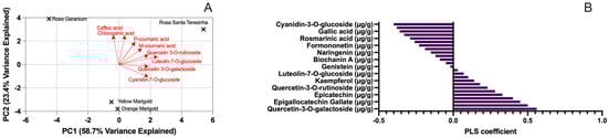 Multivariate analysis of phenolic composition and antioxidant contributions in edible flowers. (A) PCA biplot illustrating the phenolic composition of edible flowers. PC1 explains 58.7% of the variance, driven by luteolin and quercetin derivatives, while PC2 explains 23.4%, associated with hydroxycinnamic acids and catechins. Sample clustering shows Rosa Santa Teresinha’s dominance in luteolin glycosides and rose geranium’s mixed phenolic profile. (B) PLS regression coefficients for total phenols, highlighting the primary phenolic compounds contributing to antioxidant capacity. Luteolin-7-O-glucoside and quercetin-3-O-galactoside exhibit the strongest positive contributions, while compounds like chlorogenic acid and caffeic acid display moderate effects.
