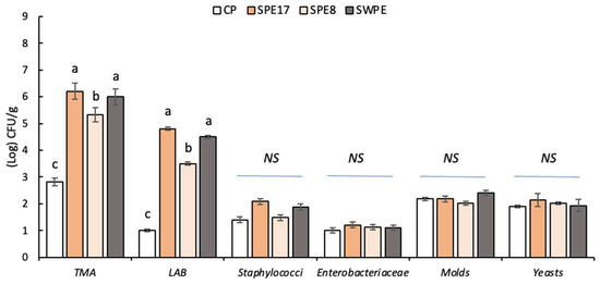 Cell density (Log CFU/g) of cultivable microbiota of the raw pasta. Control sample (CP), samples with different percentages of PE substitution (SPE17 and SPE8), and sample containing both whole-meal semolina and PE (SWPE). Each bar represents the average (±SD) of 3 replicates. On the bars, different letters indicate significant differences (p < 0.05; ANOVA corrected by Tukey’s HSD test), while NS (not significant) indicates a p > 0.05.