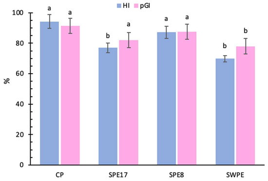 Hydrolysis index (HI) and predictive glycemic index (pGI) percentages of the control sample (CP), samples with different percentages of PE substitution (SPE17 and SPE8), and sample containing both whole-meal semolina and PE (SWPE). Each bar represents the average (±SD) of 3 replicates. On the bars, different letters indicate significant differences (p < 0.05; ANOVA corrected by Tukey’s HSD test).