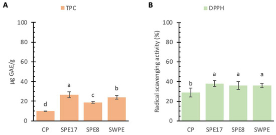 Total phenol content (TPC, panel A) and radical scavenging activity (panel B) found in the control sample (CP), samples with different percentages of PE substitution (SPE17 and SPE8), and sample containing both whole-meal semolina and PE (SWPE). Each bar represents the average (±SD) of 3 replicates. On the bars, different letters indicate significant differences (p < 0.05; ANOVA corrected by Tukey’s HSD test).