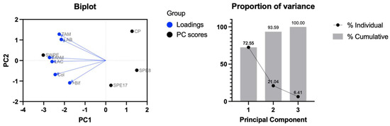 Biplot (loading and PC scores) of the principal component analysis (PCA) of culturable fecal microbiota cell density after simulated (in vitro) colonic fermentation of the control sample (CP), samples with different percentages of PE substitution (SPE17 and SPE8), and sample containing both whole-meal semolina and PE (SWPE). Variable abbreviations: TAMs, total aerobic microbes; TAnM, total anaerobic microbes; LAB, bacillus-shaped lactic acid bacteria; LAC, coccus-shaped lactic acid bacteria; Bif, bifidobacteria; Col, coliforms.