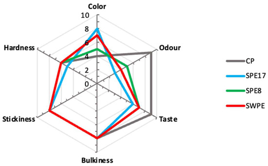 Spider graph of sensory analysis results concerning the control sample (CP), samples with different percentages of PE substitution (SPE17 and SPE8), and sample containing both whole-meal semolina and PE (SWPE).