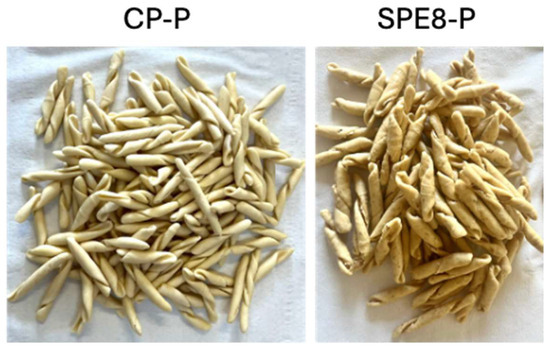 Based on overall merging and evaluation of the data obtained at the laboratory level concerning the pasta characterization and following an analysis of the management and production costs by the research partner Pastificio Martimucci S.r.l. (Altamura, Italy), we evaluated which sample was suitable for proceeding with the production and packaging of the same at the factory level. Given the choice of dough, a batch of CP and the related prototype of the SPE8 sample were produced, pasteurized, and packaged at the same time as the choice of changing the pasta shape from “tagliatelle” to “trofie”. To produce fortified pasta on a semi-industrial scale, 43.75 kg of semolina was mixed with 6.25 kg of mushroom flour and 10 L of water. The semolina particles had grain sizes in a range of 180–355 μm. Semolina had 15% moisture, ash was 0.86 g/100 g, proteins were 13.3 g/100 g, and dry gluten was 11 g/100 g. The kneading lasted 20 min. The system used (Pavan group, Padua) was Teflon. The moisture yield of the pasta was 30%. The fresh pasta was heat treated. An initial treatment was applied to the bulk product at 73 °C for 3 min. Subsequently, the product packaged in a modified atmosphere (ATM) in 500 g aliquots was re-treated at 73 °C for a further 3 min and stored for 110 days at 4 °C. The same production and thermal process was used for the control pasta. The fresh pasta samples produced were refrigerated at 4 °C until the time of additional analysis.