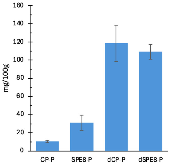 Fungi, particularly those of the Pleurotus genus, are a rich source of antioxidant polysaccharides, including phenolic compounds, polyketides, terpenes, and steroids [78,79]. Given this evidence, the antioxidant properties of cooked pasta were assessed in terms of TPC and radical scavenging activity (Figure 4). All PE-containing samples exhibited significantly higher TPC values compared to the CP. Among them, SPE17 had the highest concentration (26.43 ± 3.05 μg GAE/g f.w.), while the CP reported the lowest. SWPE demonstrated a significantly higher TPC value compared to SPE8 (23.94 ± 2.19 vs. 18.81 ± 1.79 μg GAE/g f.w.). This increase can be attributed to the phenolic compounds present in the wheat germ and bran of whole-meal semolina [17]. These TPC values were reflected in the radical scavenging activity of the PE-containing samples, all of which showed significantly higher activity than the CP, although no significant differences were observed among the enriched samples themselves. The BHT test further confirmed this trend.
