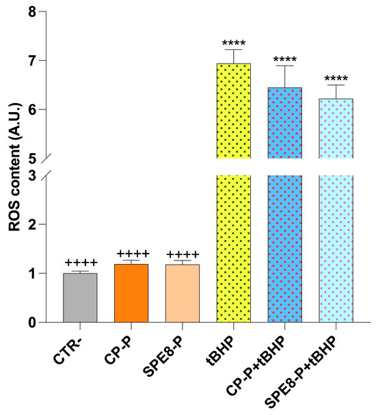 Intracellular reactive oxygen species (ROS) levels were assessed using dihydrorhodamine-123 (DHR-123). Cells were incubated with DHR-123 (10 μM) at 37 °C for 30 min, after which the medium was replaced with complete DMEM, and cells were further incubated for an additional 30 min. Cells were subsequently lysed using radioimmunoprecipitation assay (RIPA) buffer, composed of 150 mM NaCl, 10 mM Tris-HCl (pH 7.2), 0.1% SDS, 1.0% Triton X-100, 1% sodium deoxycholate, and 5 mM EDTA. Lysates were centrifuged at 12,000× g for 10 min at 4 °C, and the resulting supernatants were collected for ROS detection, as previously detailed [32]. For the positive control, cells were treated with tert-butyl hydroperoxide (tBHP, 2 mM) for 30 min. Fluorescence emission was recorded using the FLUOstar Omega fluorimeter (BMG LABTECH), with excitation and emission wavelengths set at 508 nm and 529 nm, respectively.