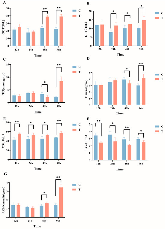Effects of intraperitoneal injection of microcystin-LR on serum biochemical indicators in GIFT tilapia: (A) GOT. (B) GPT. (C) TG. (D) TC. (E) C3. (F) LYZ. (G) AKP. The results are expressed as the means ± SD (n = 8). * p < 0.05; ** p < 0.01. Compared with the control group.