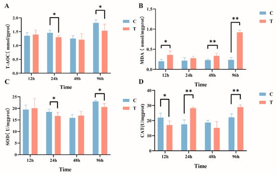 Effects of intraperitoneal injection of microcystin-LR on liver biochemical indicators in GIFT tilapia (A) T-AOC. (B) MDA. (C) SOD. (D) CAT. The results are expressed as the means ± SD (n = 8). * p < 0.05; ** p < 0.01. Compared with the control group.