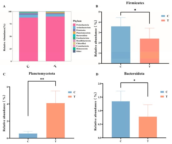 (A) Stacked bar chart of gut microbiota. (B) The variation in the relative abundance of Firmicutes. (C) The variation in the relative abundance of Planctomycetota. (D) The variation in the relative abundance of Bacteroidota. * p < 0.05; ** p < 0.01. Compared with the control group.