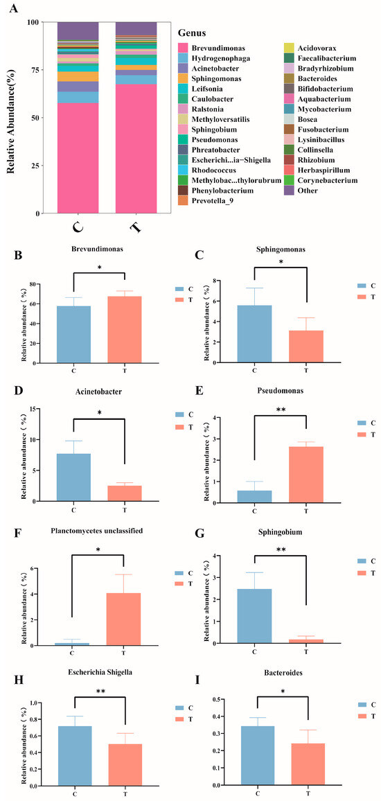 At the genus level (Figure 4A), in the control group, the dominant bacteria genera were Brevundimonas (57.81%), Hydrogenophaga (5.90%), Acinetobacter (5.37%), and Sphingomonas (5.12%); in the MC-LR treatment group, the dominant bacteria genera were Brevundimonas (67.65%), Hydrogenophaga (4.70%), Leifsonia (2.98%), and Acinetobacter (2.72%). Compared with the control group, the relative abundance of Brevundimonas, Pseudomonas, and Planctomycetes_unclassified significantly increased (Figure 4B,E,F), whereas the relative abundance of Sphingomonas, Acinetobacter, Sphingobium, Escherichia-Shigella, and Bacteroides significantly decreased (Figure 4C,D,G–I; p < 0.05).