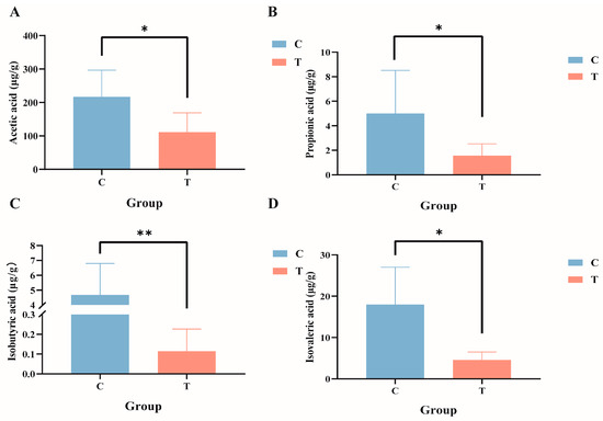 Composition of short-chain fatty acids in the gut contents of GIFT tilapia. (A) Acetic acid; (B) propionic acid; (C) isobutyric acid; and (D) isovaleric acid. * p < 0.05; ** p < 0.01. Compared with the control group.