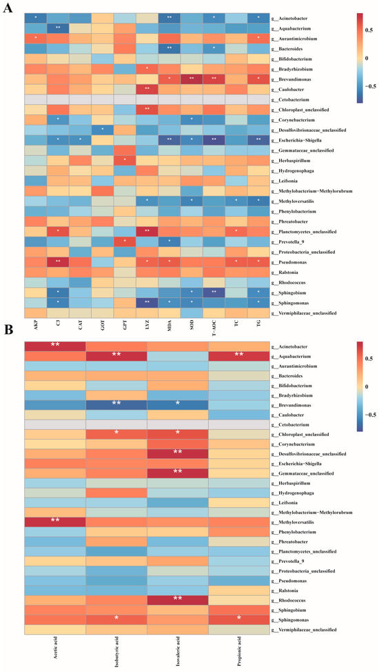 Pearson rank correlation matrix between the intestinal microbiota of GIFT tilapia after treatment and biochemical indicators, as well as SCFAs. (A) Correlation analysis of gut microbiota and biochemical indicators. (B) Correlation analysis of gut microbiota and short-chain fatty acids, * p < 0.05; ** p < 0.01.