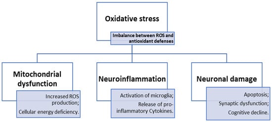 Inflammation is a major contributor to OS in the brain, as neuroinflammatory responses can activate glial cells that generate pro-inflammatory cytokines and ROS [10]. This inflammatory state can harm neuronal cells and compromise the blood–brain barrier (BBB) [10].