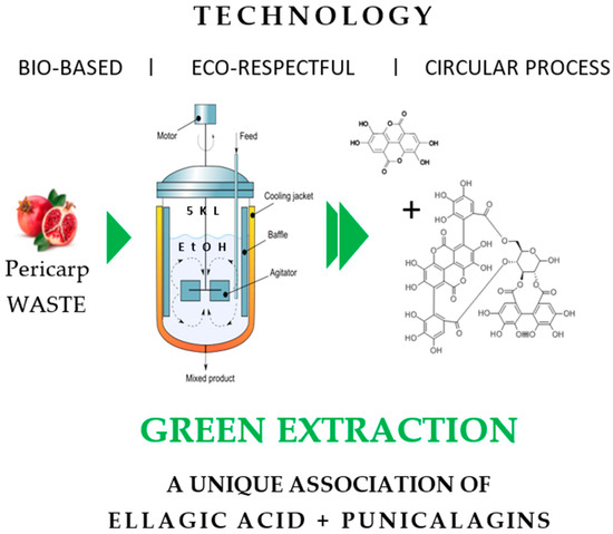 Despite the many advances in the photoprotection skin category, there is still a growing demand for natural daily photoprotection active ingredients that offer broader protection against skin damage caused by UVA exposure. Additionally, it is well known that some UV filters do not protect the skin efficiently against the full UV spectrum, especially in the UVA1 domain, and therefore do not fully prevent ROS generation and its consequences. Therefore, the addition of antioxidants in photoprotective formulations can offer new ways to prevent oxidative damage caused by ROS [14]. In our quest to discover new, disruptive photoprotective ingredients, we were drawn to the non-edible part of the pomegranate pericarp, which is generally regarded as waste and disposed of as compost or for the generation of biogas. Interestingly, the pericarp has a diverse polyphenolic profile that drew our attention to engineer a novel patented extract “POMAOX” using a one-pot green extraction with a desired spectrum of phenolic components comprising of <42% αβ-punicalagins, αβ-punicalins, and ellagic acid. POMAOX is readily biodegradable and ecofriendly by design and our one-pot green extraction optimized process enabled the sustainable exploitation of waste and byproducts of the pomegranate supply chain. Additionally, the process was innovative and offered a commercially viable approach to deliver a specific polyphenol composition with high efficacy and remains relevant in the context of a cosmetic industrial environment.