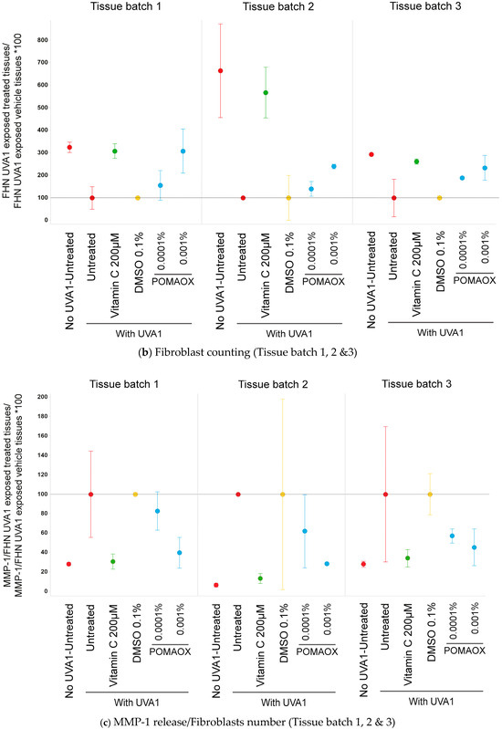 For POMAOX and Vitamin C, the interpretation of the photoprotective activity was established in comparison to the UVA-exposed vehicle control, respectively DMSO 0.1% and culture medium (untreated, UVA1-exposed condition).
