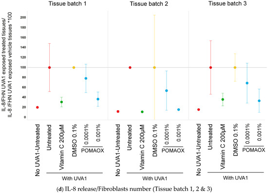 After UVA1 exposure at 35 J/cm2, the release of MMP-1 and pro-inflammatory mediators levels (IL-1α, IL-1ra, IL-6, IL-8, GM-CSF, and TNF-α) in the culture medium of reconstructed skin samples was quantified and normalized by dermal fibroblast number. After UVA1 exposure all the protein levels were comparatively higher than levels measured in unexposed samples (0 J/cm2). The level of MMP-1 normalized by dermal fibroblast number is presented in Figure 3c. In samples treated with POMAOX at 0.001%, there was a decrease in MMP-1 production comparable to the effect obtained after treatment with Vitamin C, indicating a strong photoprotective effect. Our results show that POMAOX can prevent the induction of MMP-1 in a UVA1-exposed condition. Results obtained with one of the main pro-inflammatory cytokines (IL-8) normalized by dermal fibroblasts number are presented in Figure 3d. On POMAOX treatment conditions, a decrease in IL-8 concentration was observed with a visible dose effect. At 0.0001% POMAOX, the level of IL-8 was comparable to that of the reference Vitamin C at 200 µM. Similarly, a significant decrease of all other cytokines’ concentration was observed at 0.0001% and 0.001% comparable for the latter to that of the reference, Vitamin C at 200 µM. The results obtained on all the different endpoints are summarized in Table 3 and Supplementary Data. Only TNF-α could not be detected, in all test conditions. This study showed that POMAOX at 0.001% presented a very strong photoprotective effect on all dermal damage endpoints including fibroblast disappearance and MMP1 release, as well as strong protection against UVA1-induced pro-inflammatory responses, with a decrease of pro-inflammatory cytokines IL-1α, IL-1ra, IL-6, IL-8, and GM-CSF. The effect of POMAOX was comparable to the effect of Vitamin C, confirming the strong potential of these new extracts to protect the skin from the deleterious impacts of UV exposure.