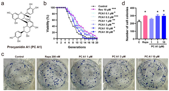 Procyanidin A1 (PC A1) isolated and purified from peanut skin extended the replicative lifespan of K6001 yeast and the yeast-like chronological lifespan of PC12 cells. (a) The chemical structure of PC A1. (b) The effect of PC A1 on the replicative lifespan of K6001 yeast. Resveratrol (Res) at 10 µM was used as the positive control. The experiment was conducted three independent times, with each replicate involving 40 individual mother cells per treatment group. The replicative lifespan was determined by counting the number of daughter cells produced by each mother cell. To assess the significance of the results, a two-sided Student’s t-test was used to compare the number of daughter cells in each treatment group to the control group. (c,d) The colony formation of PC12 cells treated with PC A1 (1, 3, and 10 µM) and rapamycin (Rapa, 200 nM) for testing the yeast-like chronological lifespan of PC12 cells. The representative images of colony-forming units (CFUs) (c) and quantification (d) are shown. Rapamycin (Rapa) was used as the positive control. Experiments were repeated three times. Data represent mean ± SEM. Significant difference was obtained with ordinary one-way ANOVA followed by Dunnett’s multiple comparisons test. *, **, and *** indicate significant differences at p < 0.05, p < 0.01, and p < 0.001 compared with the control (C) group, respectively.