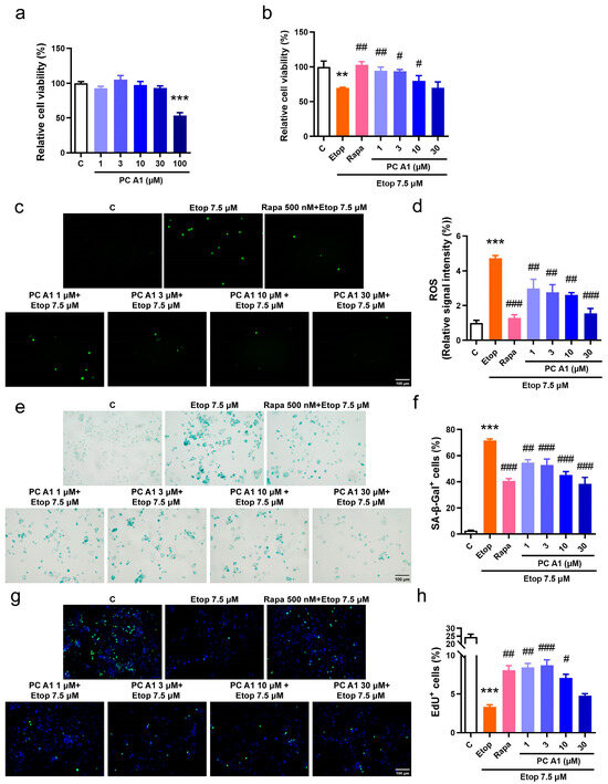 The evaluation of cellular senescence as a hallmark of aging was conducted. Cellular senescence is characterized by elevated levels of ROS, an increased expression of SA-β-gal, and arrested cell proliferation. Etoposide (Etop), a chemotherapy agent, inhibits topoisomerase II, destroys the rejoining of DNA after superhelical unwinding, induces DNA damage, and subsequently leads to cell cycle arrest and senescence. Therefore, Etop was employed to model the pathological conditions associated with cellular senescence. The PC12 cell line, derived from a pheochromocytoma of the rat adrenal medulla, is widely utilized in neuroscience research, including studies on neuroprotection, neurosecretion, neuroinflammation, and synaptogenesis [26]. Recent studies also demonstrated that PC12 cells are valuable in simulating the cellular changes associated with nervous system aging [27]. Initially, the viability of PC12 cells following treatment with PC A1 was assessed. The results indicated that PC A1 (at concentrations of 1, 3, 10, and 30 µM) did not exhibit any significant cytotoxic effects on normal PC12 cells, whereas the treatment of PC A1 at 100 µM resulted in a 50% reduction in cellular viability (Figure 2a). Subsequently, PC12 cells were pre-treated with PC A1 (at 1, 3, 10, and 30 µM) for one day and then exposed to Etop (7.5 µM) for 2 days to evaluate the protective effect of PC A1 against cell senescence. Rapa at 500 nM was used as a positive control due to its known geroprotective effects [15]. Cell viability was assessed using the MTT assay, and the results demonstrated that PC A1 (at 1, 3, and 10 µM) and Rapa (500 nM) significantly mitigated the loss of cellular viability caused by Etop (Figure 2b). Furthermore, the level of ROS was found to be elevated by Etop; however, treatment with PC A1 (1, 3, 10, and 30 µM) and Rapa (500 nM) significantly reduced ROS levels (Figure 2c,d). Subsequently, SA-β-gal staining was performed, as shown in Figure 2e,f, and quantitative analysis revealed that over 70% of Etop-treated cells exhibited a senescent phenotype characterized by SA-β-gal-positive cells. In contrast, the pre-treatment of PC A1 (at 1, 3, 10, and 30 µM) significantly decreased the number of SA-β-gal-positive PC12 cells. Cell cycle arrest, another hallmark of cell senescence, was assessed using the EdU cell proliferation kit. EdU, a thymidine analog, was incorporated into DNA during synthesis, followed by a click reaction with a green fluorescence-labeled azide probe, thereby labeling newly synthesized DNA for the detection of proliferating cells. To visualize all cells, nuclei were stained with Hoechst 33342. As shown in Figure 2g,h, nearly 25% of the PC12 cells in the control group were EdU positive, exhibiting green fluorescence, whereas this percentage dropped to 4% in Etop-induced senescent cells. The pre-treatment of PC A1 (1, 3, and 10 µM) and Rapa (500 nM) protected against the proliferative impairment caused by Etop. These experimental findings suggest that PC A1 effectively prevented cellular viability loss, reduced ROS levels, decreased the number of SA-β-gal-positive senescent cells, and restored proliferative capacity, thereby alleviating Etop-induced senescence in PC12 cells.