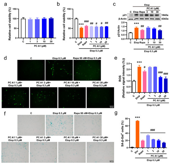 To further confirm the cell senescence alleviation effect of PC A1, we then induced cell senescence using Etop in the NIH/3T3 cell line. The NIH/3T3 mouse embryonic fibroblast cell line serves as a vital model for in vitro research, particularly in the fields of cellular senescence and cell cycle studies. Considering that NIH/3T3 cells exhibit greater sensitivity to Rapa and Etop, the concentration of Rapa was adjusted to 50 nM to serve as a positive control, whereas the dose of Etop was reduced to 0.3 µM. The effect of PC A1 on cellular viability was also assessed. As shown in Figure 3a, PC A1 (at 1, 3, 10, and 30 µM) demonstrated no toxicity to NIH/3T3 cells. Following this, NIH/3T3 cells were pre-treated with PC A1, subsequently inducing cell senescence with Etop for 2 days, and then we evaluated cellular viability, the expression of p21, ROS levels, and SA-β-gal activity. The results in Figure 3b show that the pre-treatment of PC A1 (1, 3, 10, and 30 µM) and Rapa (50 nM) significantly protected NIH/3T3 cells from the loss of viability. The expression levels of p21, a biomarker of cellular senescence, were then assessed. As shown in Figure 3c, PC A1 at 30 µM and Rapa reduced p21 levels elevated by Etop. The results of ROS assays (Figure 3d,e) and SA-β-gal staining (Figure 3f,g) were consistent with those obtained from the PC12 cells, demonstrating that both PC A1 and Rapa significantly decreased ROS levels and the number of senescent cells, as indicated by SA-β-gal-positive cells. In conclusion, PC A1 alleviated cellular senescence induced by Etop in both PC12 and NIH/3T3 cells.