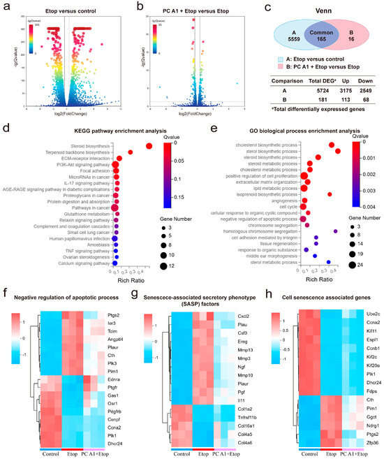 RNA sequencing analysis on senescent NIH/3T3 cells treated with procyanidin A1 (PC A1). NIH/3T3 cells were pre-treated with PC A1 (10 µM) for 24 h followed by 0.3 µM of etoposide (Etop) for 48 h. RNA was extracted from cells lysis for RNA sequencing analysis. (a) Volcano plot of gene expression in the Etop group compared to the control group. (b) Volcano plot of gene expression in the PC A1 + Etop group compared to the Etop group. In the volcano plot, the two vertical dashed lines indicate log2(FoldChange) values of −0.5 and 0.5, while the horizontal dashed line represents a Q-value threshold of 0.05. Genes with log2(FoldChange) ≥ 0.5 or ≤−0.5 and a Q value ≤ 0.05 were identified as differentially expressed. (c) Venn diagram showing the number of differentially expressed genes (DEGs, with log2FoldChange (FC) ≥ 0.5 or ≤−0.5, Q value ≤ 0.05, calculated by raw count value) and overlapped genes between A and B (A. Etop group versus control group; B. PC A1 + Etop group versus Etop group). (d) KEGG pathway enrichment analysis of the overlapped 165 common differentially expressed genes. (e) GO biological processes associated with the 165 common differentially expressed genes. (f) Heatmaps of genes associated with negative regulation of the apoptosis process. (g) Heatmaps of genes associated with senescence associated secretory phenotype (SASP) factors in different groups. (h) Heatmaps of cell senescence-related genes according to the CellAge database. n = 3 for each group. n stands for the number of samples in a group.