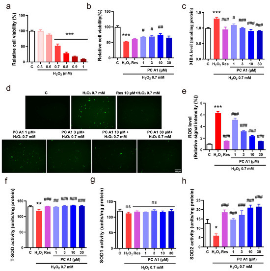 In organisms, the aging process is associated with progressive mitochondrial dysfunction, leading to an increased production of ROS. The pathological level of ROS contributes to further mitochondrial deterioration and widespread cellular damage, including harm to DNA, proteins, and lipids, which are significant factors in aging and age-related diseases [29,30]. Therefore, we investigated the ability of PC A1 to reduce ROS and protect PC12 cells from oxidative stress. H2O2, the most commonly used endogenous source of cellular oxidative stress, was employed to induce this condition. Initially, the appropriate concentration of H2O2 was pre-tested. After incubating cells with varying doses of H2O2 for 2 h, cell viability was assessed using the MTT assay. As shown in Figure 5a, H2O2 at 0.7 mM resulted in a 50% reduction in cell viability compared to the control and was chosen as an appropriate concentration for further experiments. Cells were subsequently treated with different doses of PC A1 for 24 h, followed by exposure to 0.7 mM H2O2 for 2 h. The findings in Figure 5b indicate that the reduction in cell viability caused by H2O2 was alleviated by the pre-treatment with PC A1 (1, 3, and 10 µM). Res was utilized as a positive control due to its well-established antioxidant properties [31]. The level of MDA, a common indicator in oxidative stress studies, was also assessed. As shown in Figure 5c, pre-treatment with Res (10 µM) and PC A1 (1, 3, 10, and 30 µM) significantly lowered the elevated MDA levels induced by H2O2. Furthermore, ROS levels were evaluated using DCFH-DA, a probe that undergoes hydrolysis and oxidation to produce fluorescent DCF. As shown in Figure 5d,e, H2O2 produced a marked increase in ROS levels, which were significantly reduced by pre-treatment with Res and PC A1 (at 1, 3, 10, and 30 µM). SOD is a crucial endogenous antioxidant enzyme that scavenges superoxide anion free radicals and protects cells from oxidative damage. The activities of total SOD, SOD1, and SOD2 were measured. The results in Figure 5f–h demonstrate the PC A1 enhanced SOD2 activity but did not affect SOD1 activity. In conclusion, PC A1 protects PC12 cells from oxidative damage induced by H2O2 by increasing SOD2 activity and reducing both ROS and MDA levels.